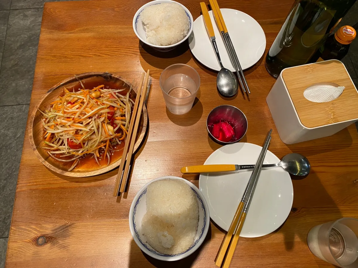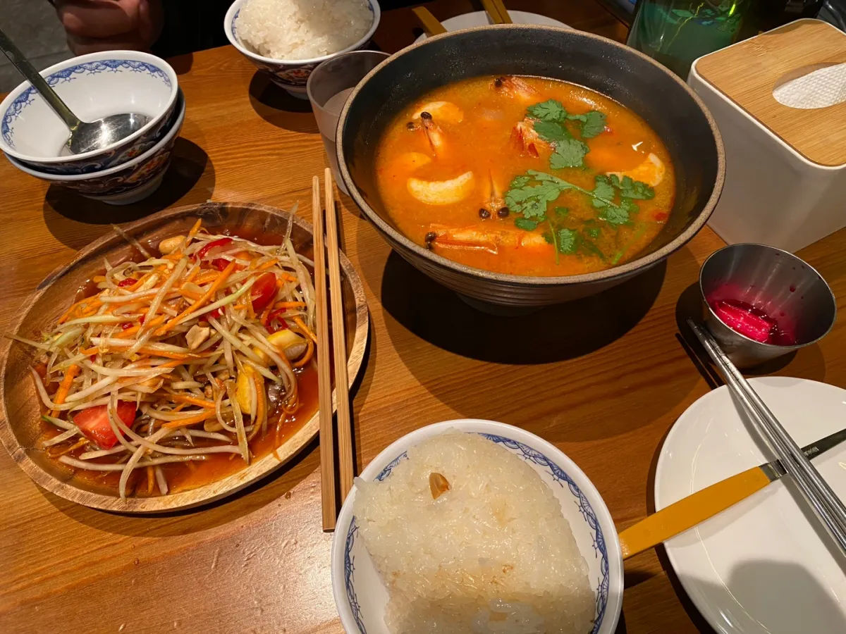 저희는 쏨땀(14,000원)과 똠양꿍(19,000원)을 그리고 카오니아오(찰쌀밥)를 주문했어요.