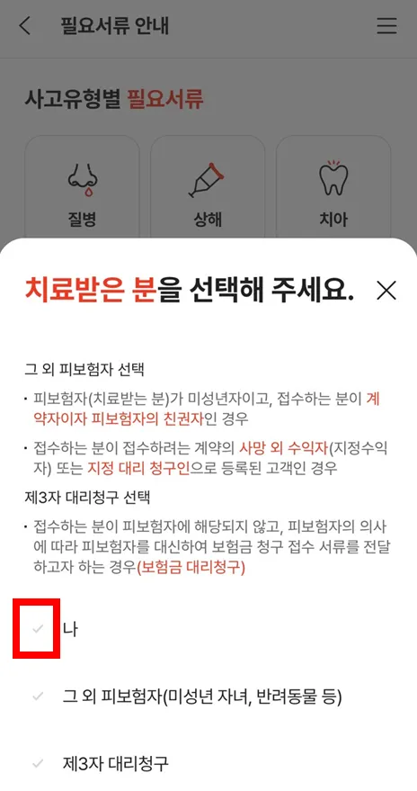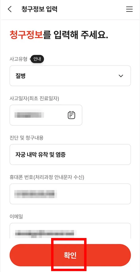'사고일자(최초 진료일자)'는 달력을 눌러 입력해 주고 '진단 및 청구내용'을 입력 후 '확인'을 누릅니다.