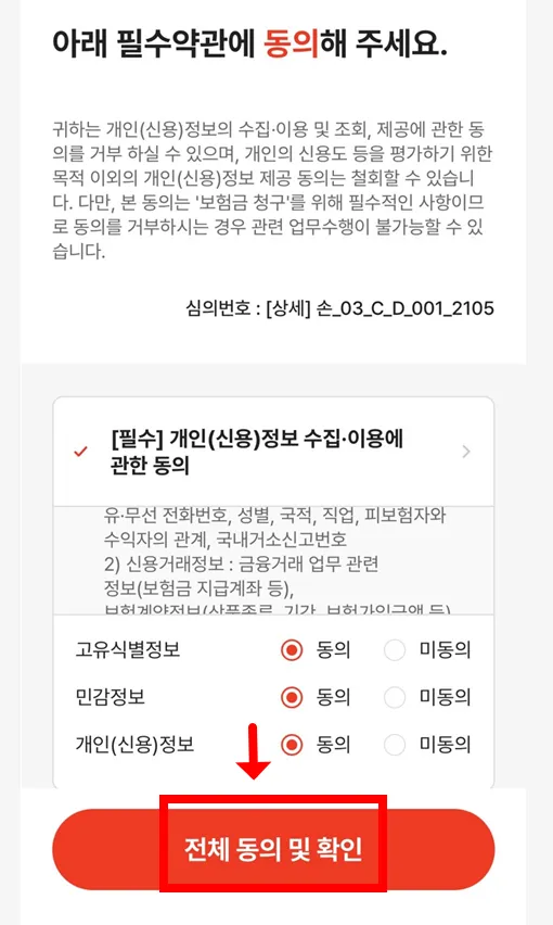 필수약관 내용을 확인하고 '전체 동의 및 확인'을 누릅니다.