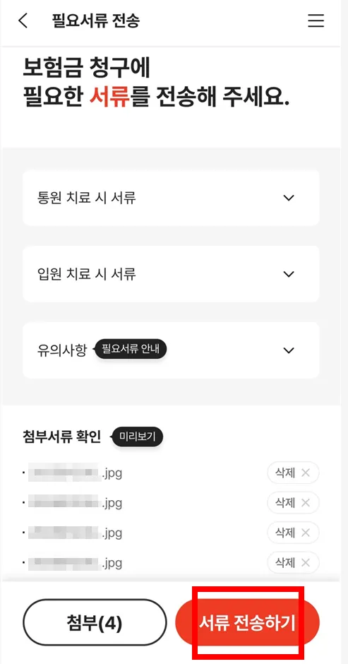 보험금 청구가 완료되었습니다. 이후 진행상황(접수번호, 보완서류 요청, 처리 완료)은 카톡 알림톡으로 받을 수 있습니다.