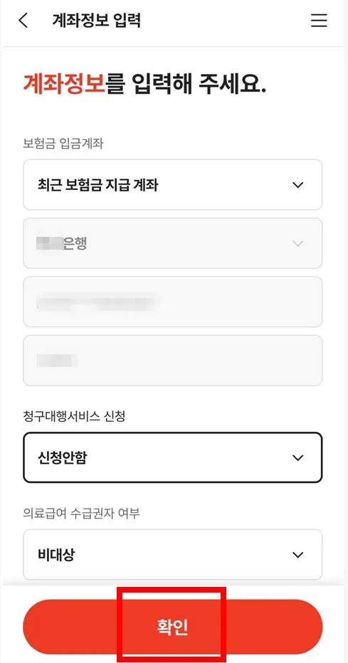 '계좌정보/청구대행 서비스 신청여부 / 의료급여 수급권자 여부'를 입력하고 '확인'을 누릅니다.