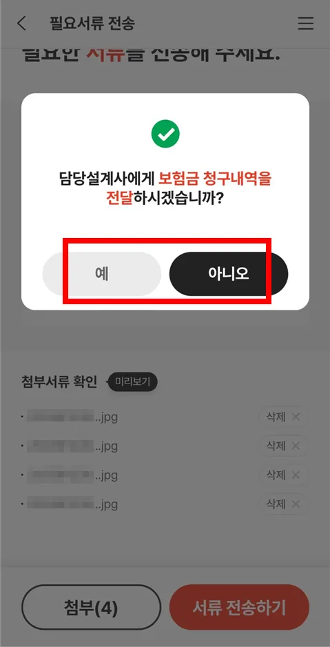 '서류 전송하기'를 누르고 담당설계사에게 전달 여부를 선택합니다.