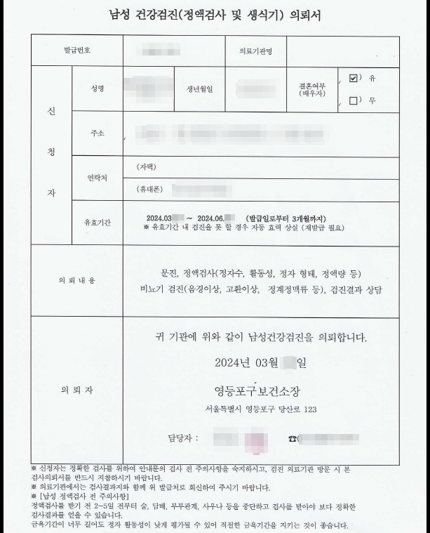 남성 건강검진(정액검사 및 생식기) 의뢰서도 받았는데 검진을 받을 수 있는 의료기관으로 가서 제출 시 무료로 받을 수 있습니다. 의뢰서 유효기간은 발급일로부터 3개월이며 유효기간 내 검진을 못할 경우 재발급이 필요합니다.