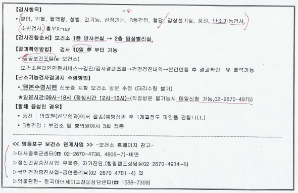 보건소 방문 전날 남편과 저 각각 문자 메시지를 받았습니다. 보건소 방문 전 8시간 금식을 했고 임신 가능성 있을 시 x-ray검사 불가하다고 해서 임신테스트도 미리 하고 방문하였습니다. 신분증이랑 주민등록등본도 준비하였습니다.