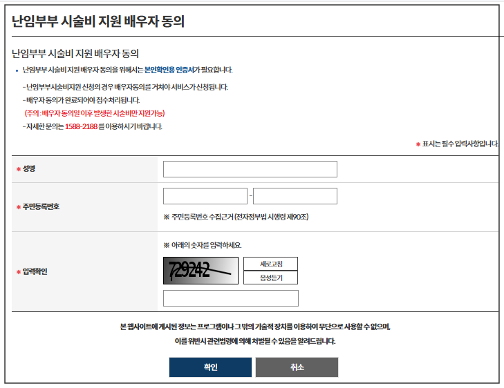 '난임부부 시술비 지원 배우자 동의' 화면을 입력 후 하단에 '확인'을 클릭합니다.