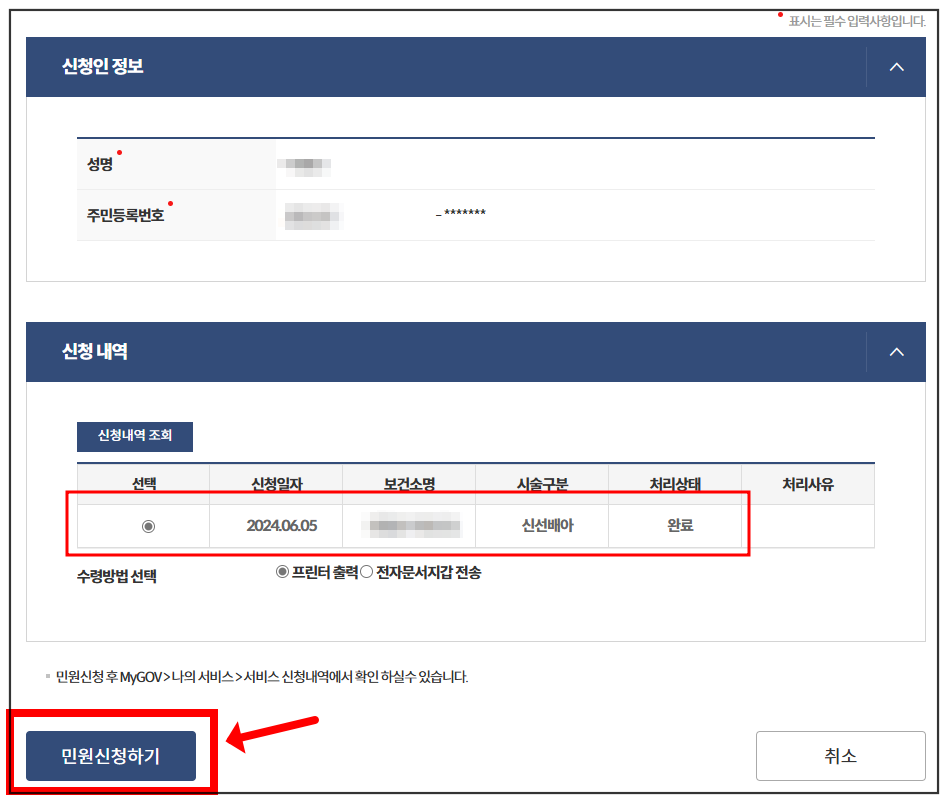 아래와 같이 조회된 내역을 확인 후 하단에 '민원신청하기'를 클릭합니다.