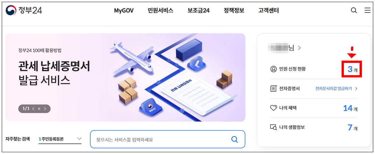 정부24에 로그인 후 민원 신청 현황을 클릭하면 확인이 가능합니다.