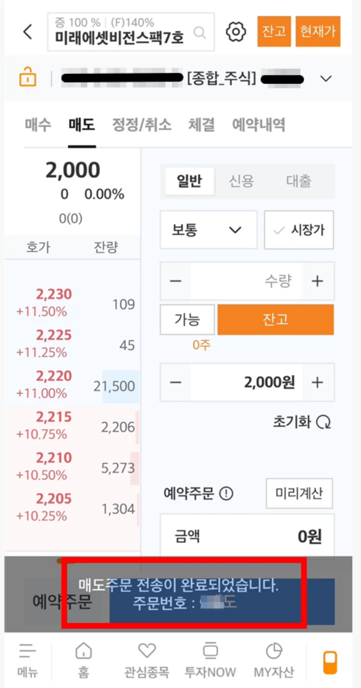 매도 주문 내용이 맞는지 보고 확인을 누르면 매도주문 전송이 완료되었다는 메시지와 함께 주문번호 확인이 가능합니다.